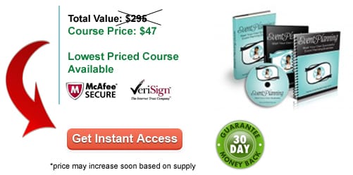 Why are we able to charge so little you might be thinking? Because selling this course is not our main business. We are an actual event planning company that puts on events for clients and that is where most of our income comes from. But we love teaching about our industry and we love what we do. So we put together this comprehensive course just for you. Get it while it's still at the low price of $47. The value of this course is $295, plus all the free bonuses you receive. It comes with a 30 day - no questions asked money back guarantee if you are unhappy with the course for any reason. You can buy it now here.